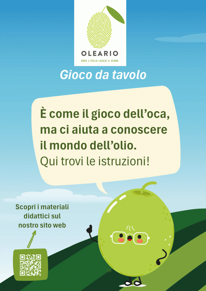 Tra le proposte di gaming del progetto OLEARIO, che già prevedono il Trivia game online, è stato realizzato un prodotto simile al tradizionale “Gioco dell’oca” interamente dedicato al mondo dell’olio. Il gioco da tavola, che rendiamo disponibile sul nostro sito con le relative istruzioni e in tre formati (A4, A3 e poster), può essere occasione di esperienza ludica e educativa sia per i più piccoli che per tutte le età.